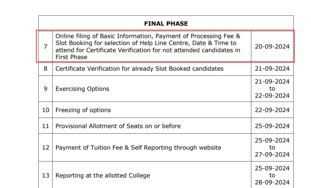 | Reporting at Allotted College (Final Phase) | September 25, 2024 – September 28, 2024 |